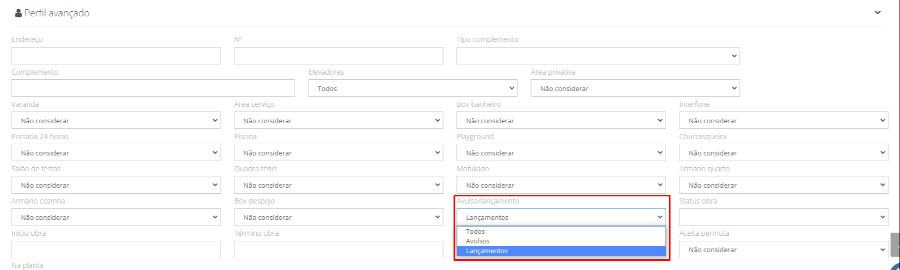 Dentro do Perfil de Atendimento - Perfil Avançado, basta selecionar se você deseja que apareça nos resultado de suas buscas somente imóveis Avulsos ou somente Lançamentos ou TODOS.
